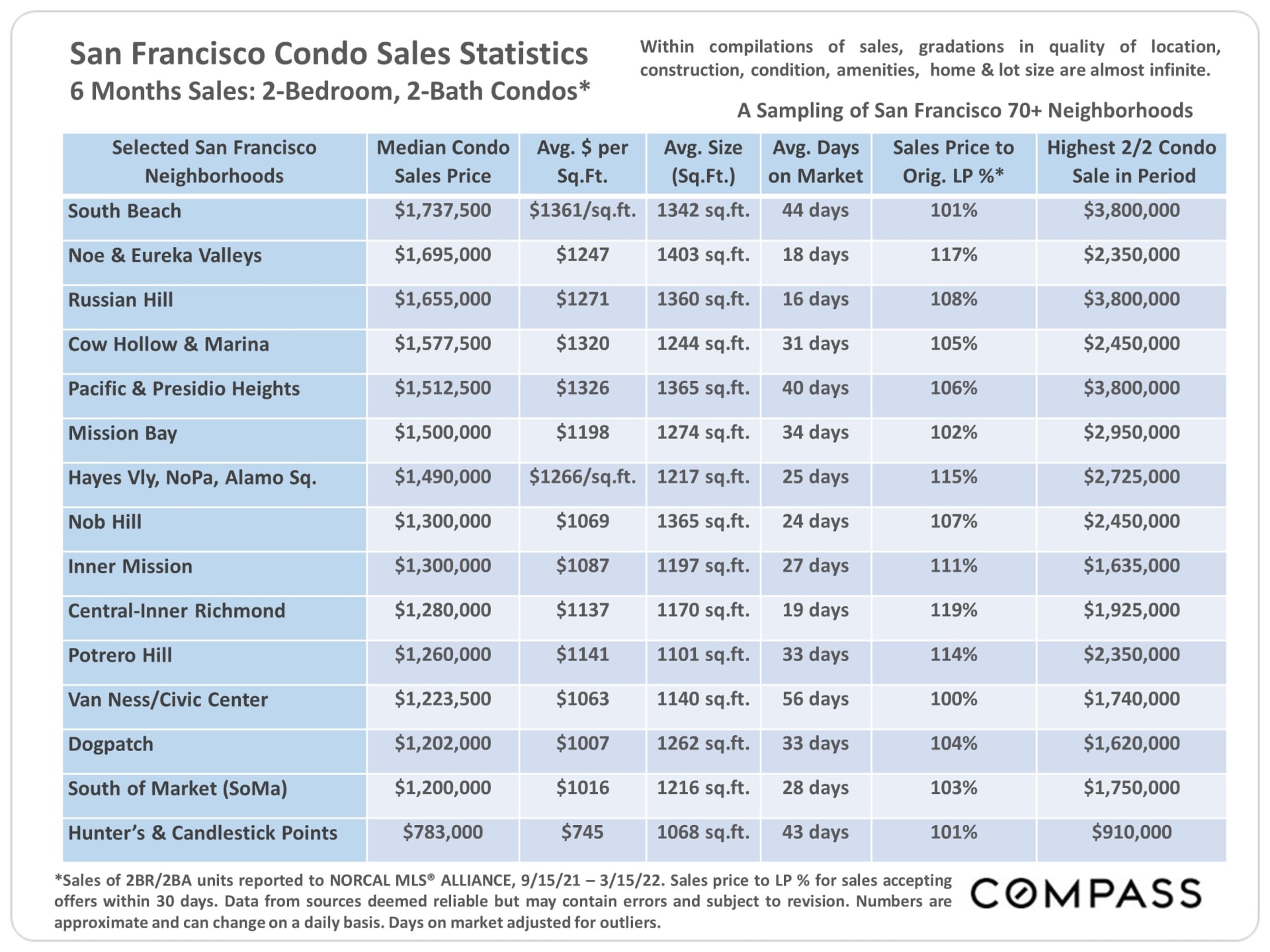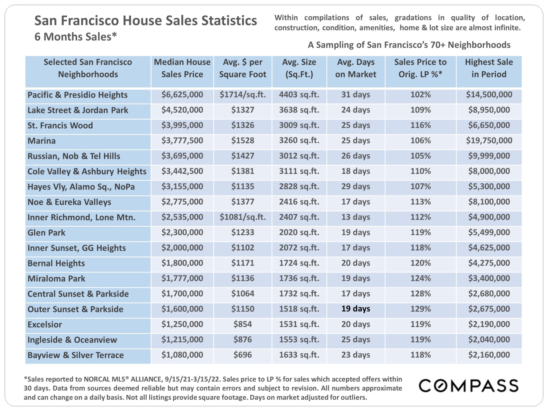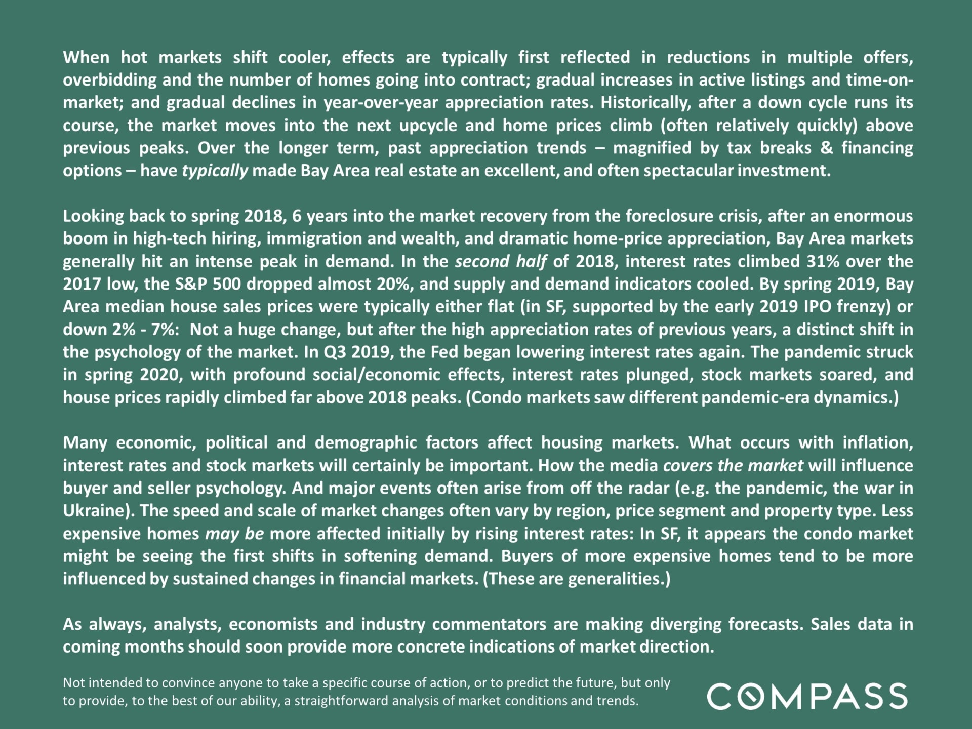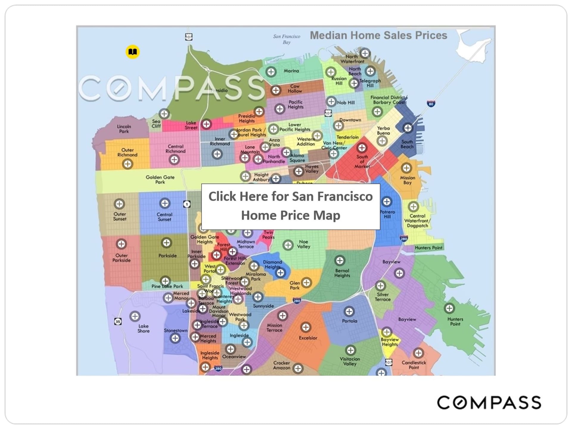 It is impossible to know how median and average value statistics apply to any particular home without a specific comparative market analysis. These analyses were made in good faith with data from sources deemed reliable, but may contain errors and are subject to revision. It is not our intent to convince you of a particular position but to attempt to provide straightforward data and analysis, so you can make your own informed decisions. Median and average statistics are enormous generalities: There are hundreds of different markets in San Francisco and the Bay Area, each with its own unique dynamics. Median prices and average dollar per square foot values can be and often are affected by other factors besides changes in fair market value. Longer-term trends are much more meaningful than short-term. Compass is a real estate broker licensed by the State of California, DRE 01527235. Equal Housing Opportunity. This report has been prepared solely for information purposes. The information herein is based on or derived from information generally available to the public and/or from sources believed to be reliable. No representation or warranty can be given with respect to the accuracy or completeness of the information. Compass disclaims any and all liability relating to this report, including without limitation any express or implied representations or warranties for statements contained in, and omissions from, the report. Nothing contained herein is intended to be or should be read as any regulatory, legal, tax, accounting or other advice and Compass does not provide such advice. All opinions are subject to change without notice. Compass makes no representation regarding the accuracy of any statements regarding any references to the laws, statutes, or regulations of any state are those of the author(s). Past performance is no guarantee of future results.
