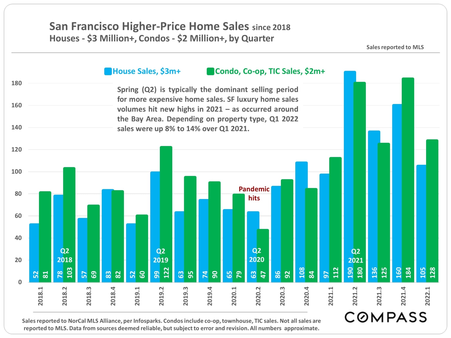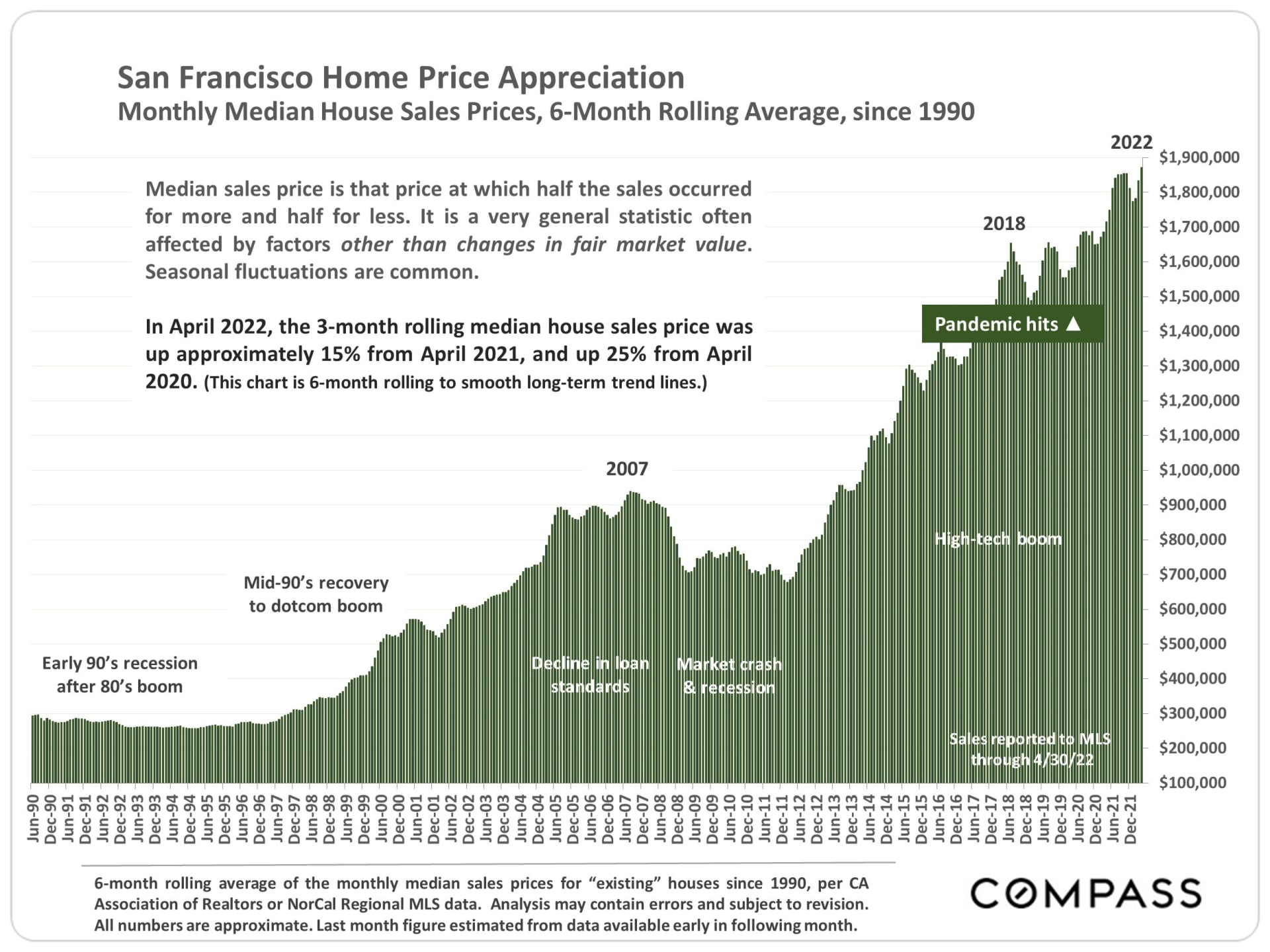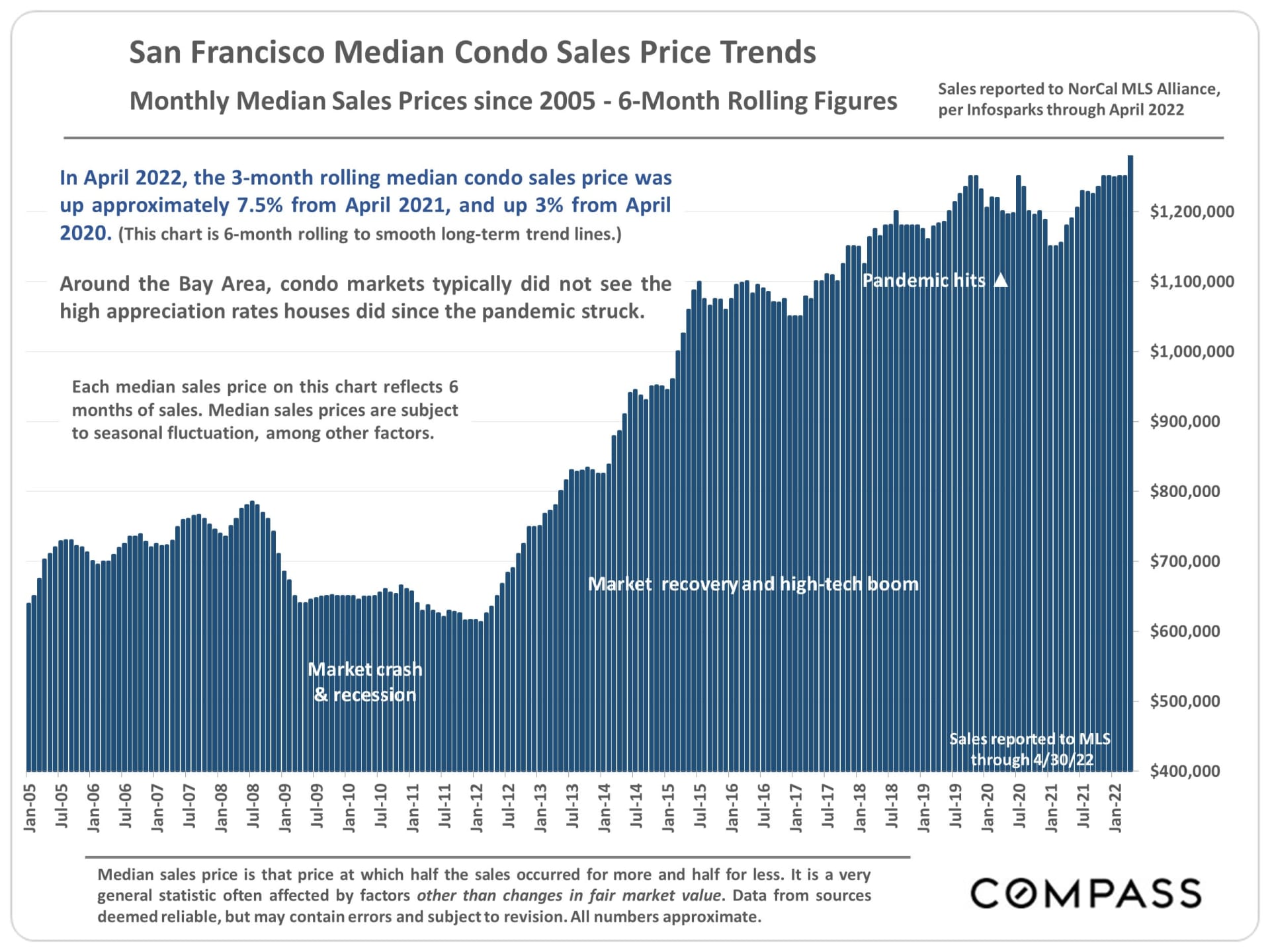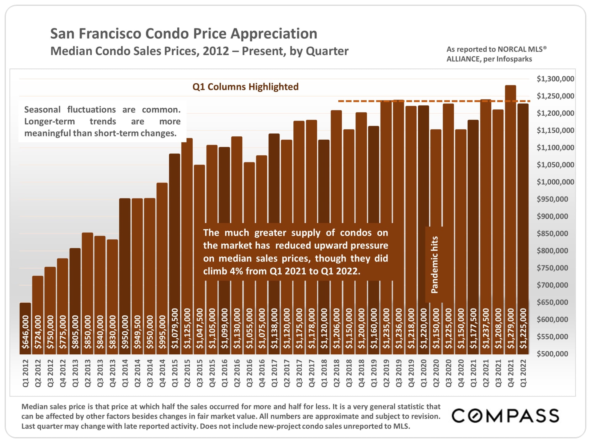 It is impossible to know how median and average value statistics apply to any particular home without a specific comparative market analysis. These analyses were made in good faith with data from sources deemed reliable, but may contain errors and are subject to revision. It is not our intent to convince you of a particular position but to attempt to provide straightforward data and analysis, so you can make your own informed decisions. Median and average statistics are enormous generalities: There are hundreds of different markets in San Francisco and the Bay Area, each with its own unique dynamics. Median prices and average dollar per square foot values can be and often are affected by other factors besides changes in fair market value. Longer-term trends are much more meaningful than short-term. Compass is a real estate broker licensed by the State of California, DRE 01527235. Equal Housing Opportunity. This report has been prepared solely for information purposes. The information herein is based on or derived from information generally available to the public and/or from sources believed to be reliable. No representation or warranty can be given with respect to the accuracy or completeness of the information. Compass disclaims any and all liability relating to this report, including without limitation any express or implied representations or warranties for statements contained in, and omissions from, the report. Nothing contained herein is intended to be or should be read as any regulatory, legal, tax, accounting or other advice and Compass does not provide such advice. All opinions are subject to change without notice. Compass makes no representation regarding the accuracy of any statements regarding any references to the laws, statutes, or regulations of any state are those of the author(s). Past performance is no guarantee of future results.