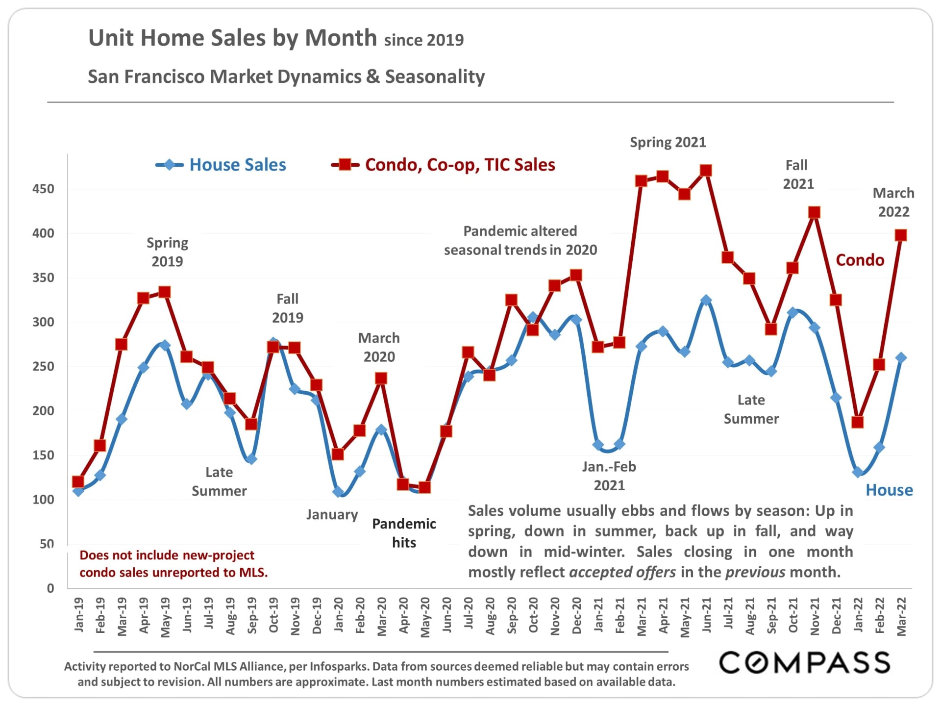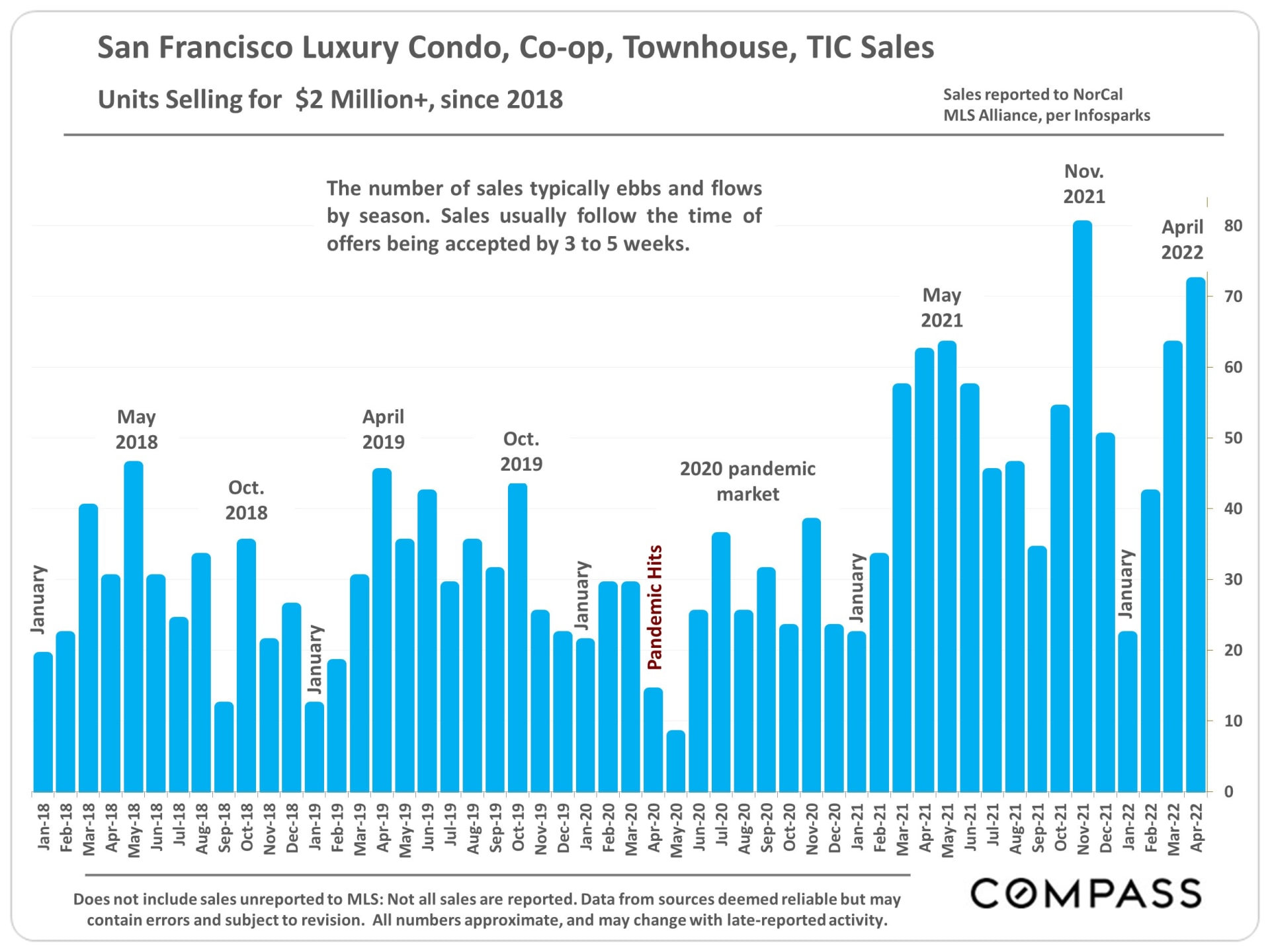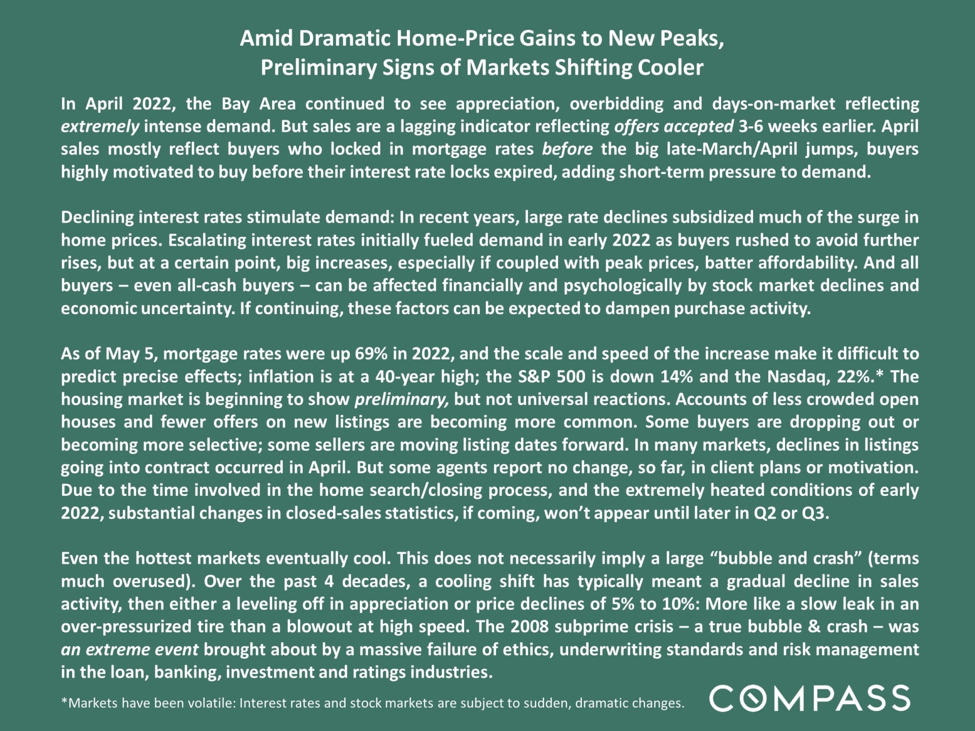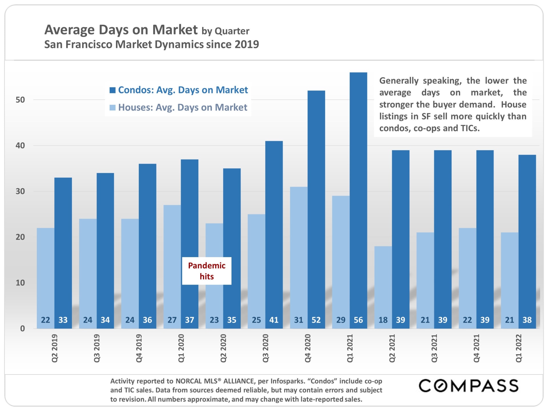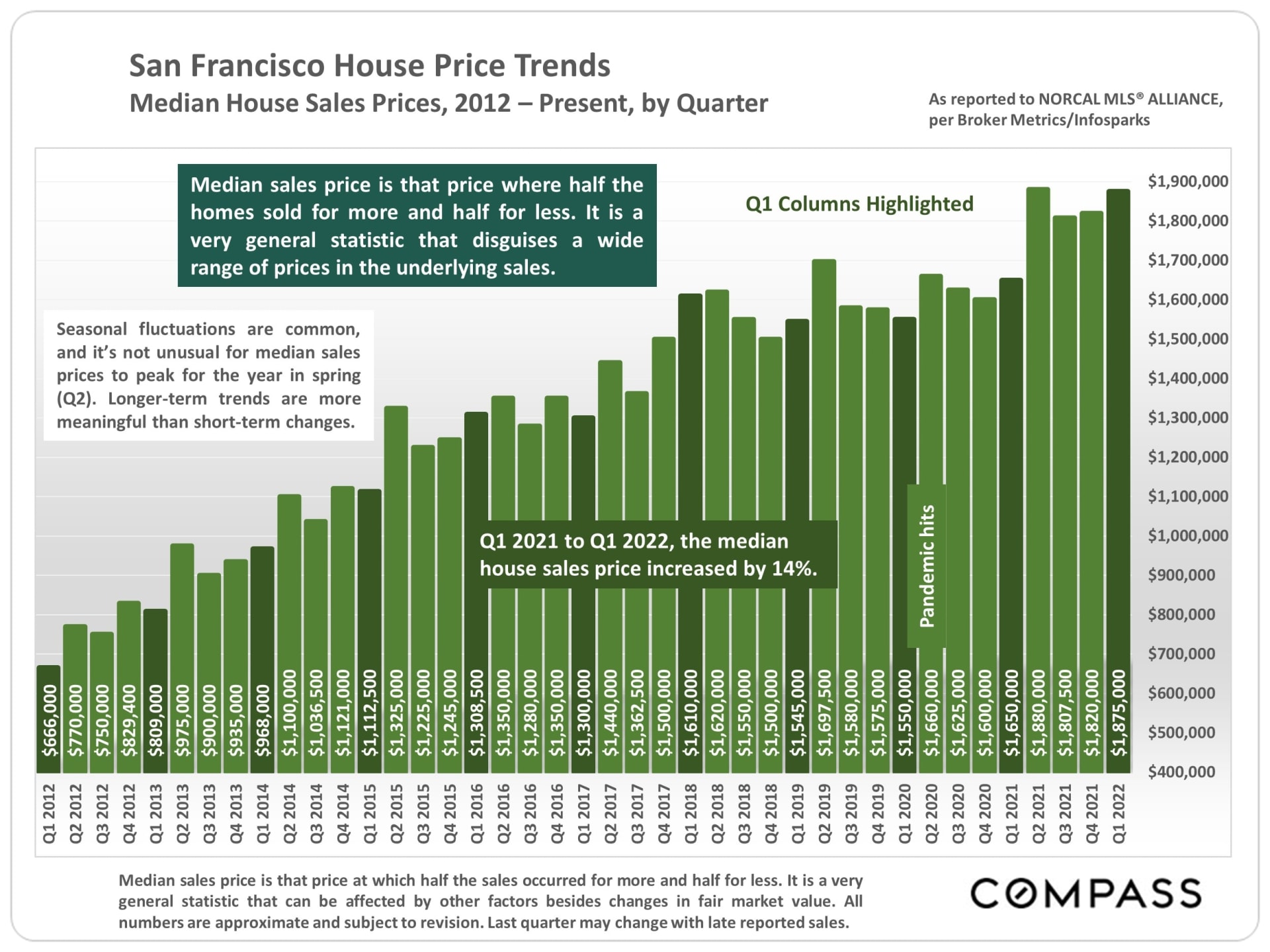 It is impossible to know how median and average value statistics apply to any particular home without a specific comparative market analysis. These analyses were made in good faith with data from sources deemed reliable, but may contain errors and are subject to revision. It is not our intent to convince you of a particular position but to attempt to provide straightforward data and analysis, so you can make your own informed decisions. Median and average statistics are enormous generalities: There are hundreds of different markets in San Francisco and the Bay Area, each with its own unique dynamics. Median prices and average dollar per square foot values can be and often are affected by other factors besides changes in fair market value. Longer-term trends are much more meaningful than short-term. Compass is a real estate broker licensed by the State of California, DRE 01527235. Equal Housing Opportunity. This report has been prepared solely for information purposes. The information herein is based on or derived from information generally available to the public and/or from sources believed to be reliable. No representation or warranty can be given with respect to the accuracy or completeness of the information. Compass disclaims any and all liability relating to this report, including without limitation any express or implied representations or warranties for statements contained in, and omissions from, the report. Nothing contained herein is intended to be or should be read as any regulatory, legal, tax, accounting or other advice and Compass does not provide such advice. All opinions are subject to change without notice. Compass makes no representation regarding the accuracy of any statements regarding any references to the laws, statutes, or regulations of any state are those of the author(s). Past performance is no guarantee of future results.
