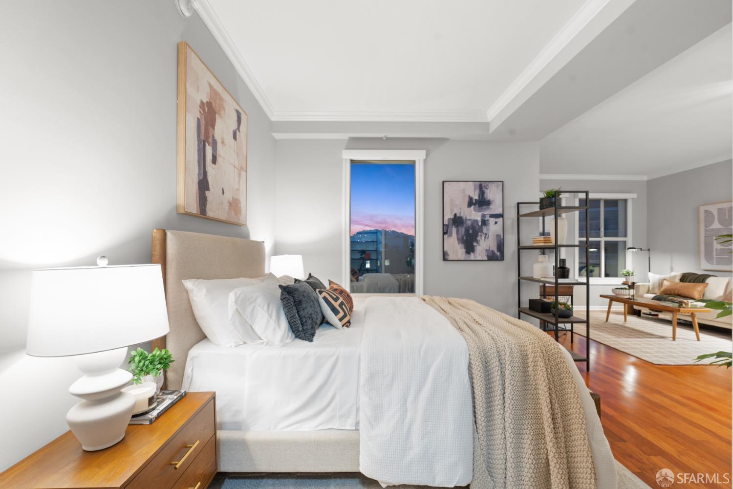 This move-in ready junior one-bedroom, one-bathroom penthouse offers modern comfort and a prime central location. The open-concept layout features hardwood floors, roller shades, and a spacious sleeping area that fits a queen or king bed, complemented by a custom walk-in closet separate from the living area. The upgraded kitchen includes sleek touchscreen appliances with a new stove and cooktop. Additional highlights include a large storage space and optional leased parking within the building for $250-$300 per month. Residents enjoy premium amenities such as a fitness center, exercise studio, conference room, landscaped courtyard with a fountain, and business meeting room. Perfectly situated in the heart of the city, this home offers unmatched walkabilityjust steps to Hayes Valley, Mission Dolores, SoMa, and Nob Hillputting the best of San Francisco's dining, shopping, and entertainment all within easy reach, along with tech shuttle stops right out front for effortless commuting.