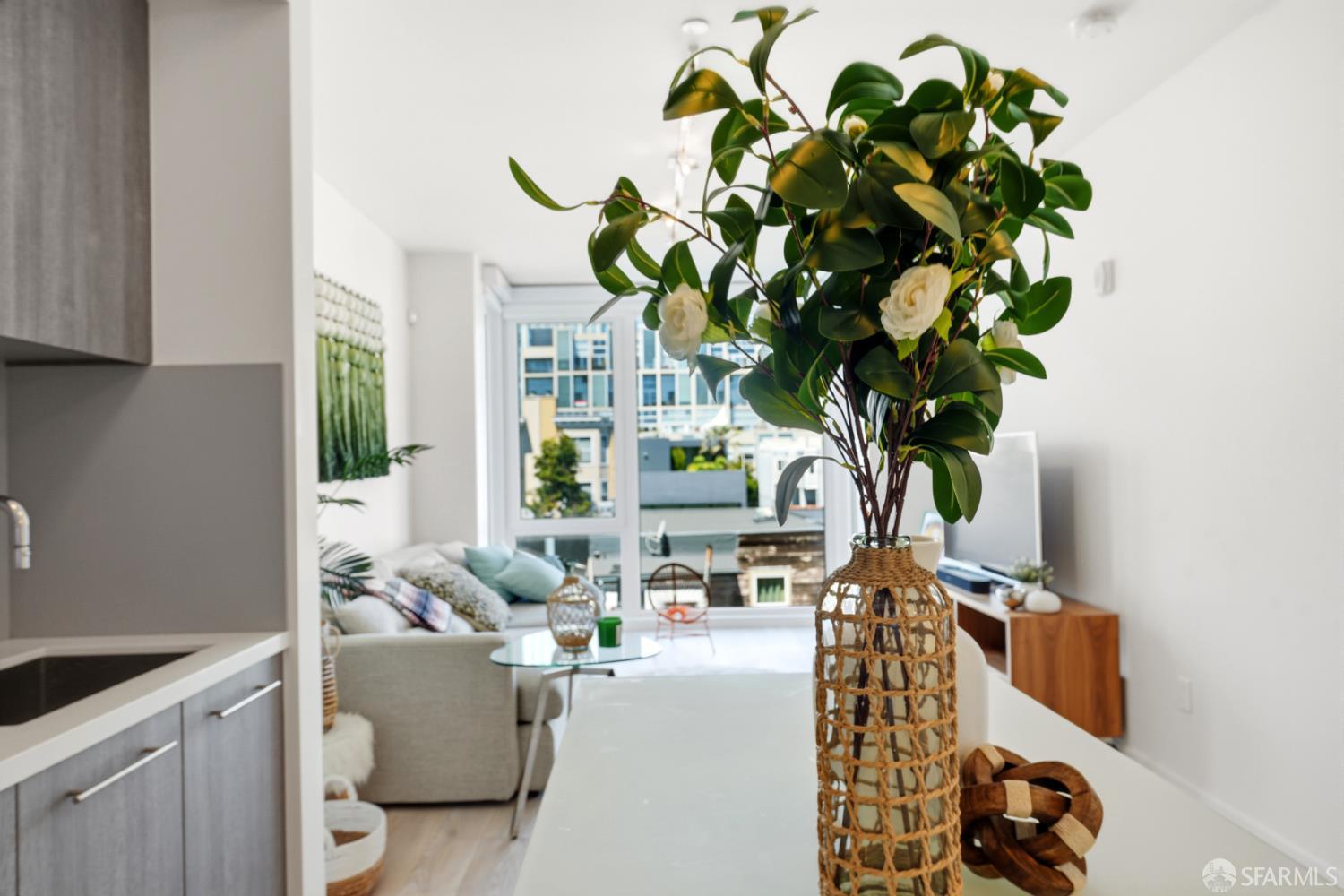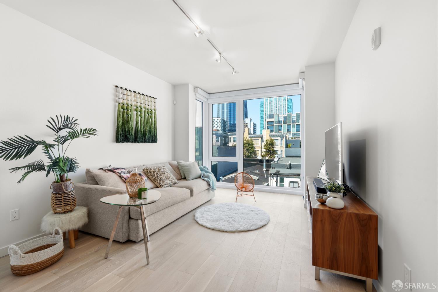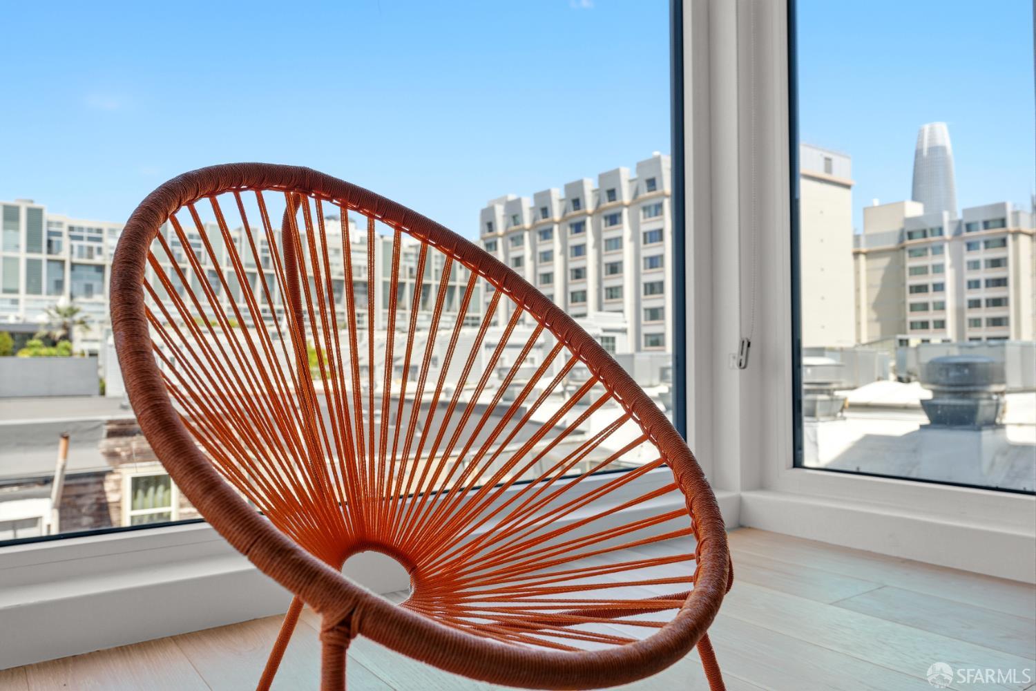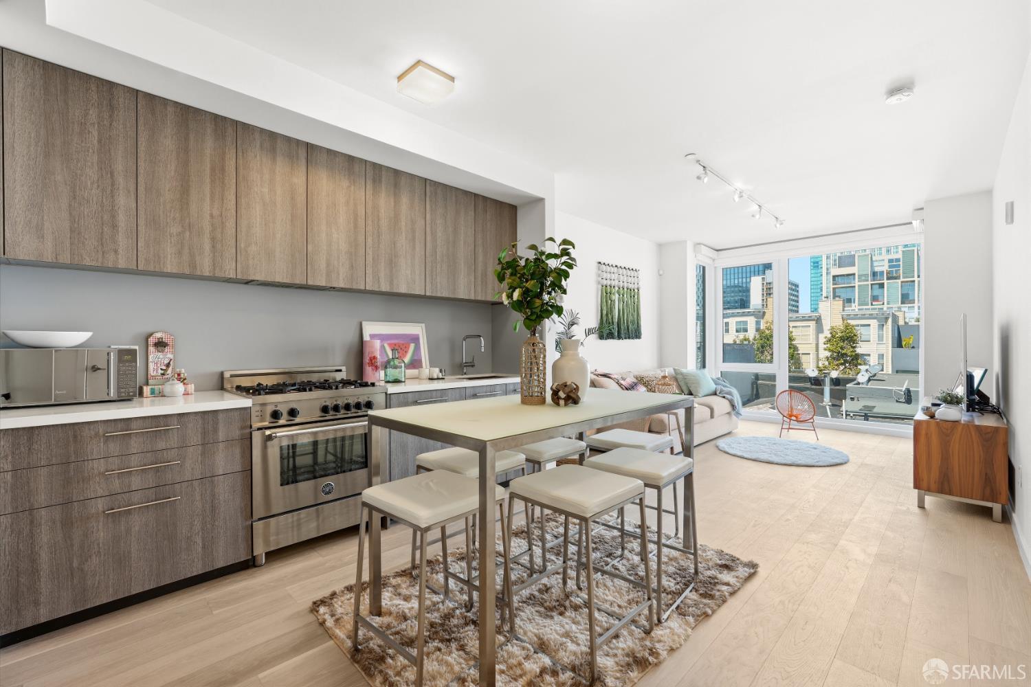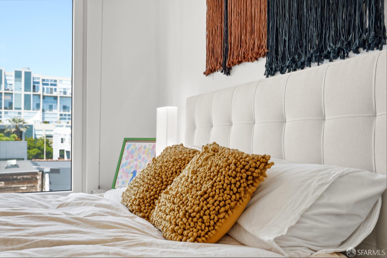 This spotless, move-in ready 1-bedroom, 1-bath condo offers stunning city views and was thoughtfully designed by San Francisco-based JS Sullivan, known for their exceptional quality and mixed-use urban developments. HOA dues include water, garbage, gas, Webpass WiFi internet, exterior insurance, and moremaking city living even more convenient. Featuring an open-concept layout and dramatic floor-to-ceiling bay windows, the home is flooded with natural light, creating a bright and airy atmosphere throughout. Inside, you'll find white oak hardwood flooring, a newly carpeted bedroom with a spacious custom-built closet, an upgraded walk-in shower with sleek glass enclosure, ample pantry storage, radiant floor heating, and elevated finishes including Grohe fixtures, Caesarstone countertops, and a Porcelanosa Krion backsplash. The chef's kitchen is complete with a vented-out gas range, Bertazzoni stove, and Bosch appliances, including a dishwasher, refrigerator, and an in-unit washer and dryer with a safety pan for added peace of mind. Built in 2015, this modern boutique 26-unit luxury building at 870 Harrison is tucked away in a quiet pocket of Yerba Buena/South Beach/SoMa, offering residents a rooftop garden with breathtaking 360-degree city views and convenient bike storage.