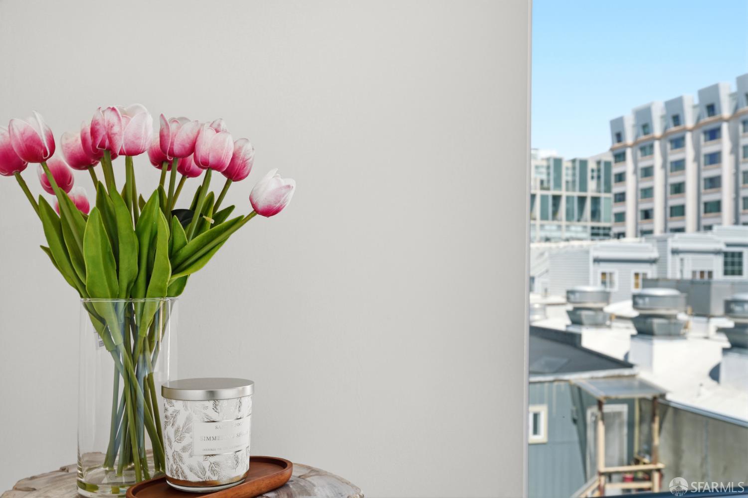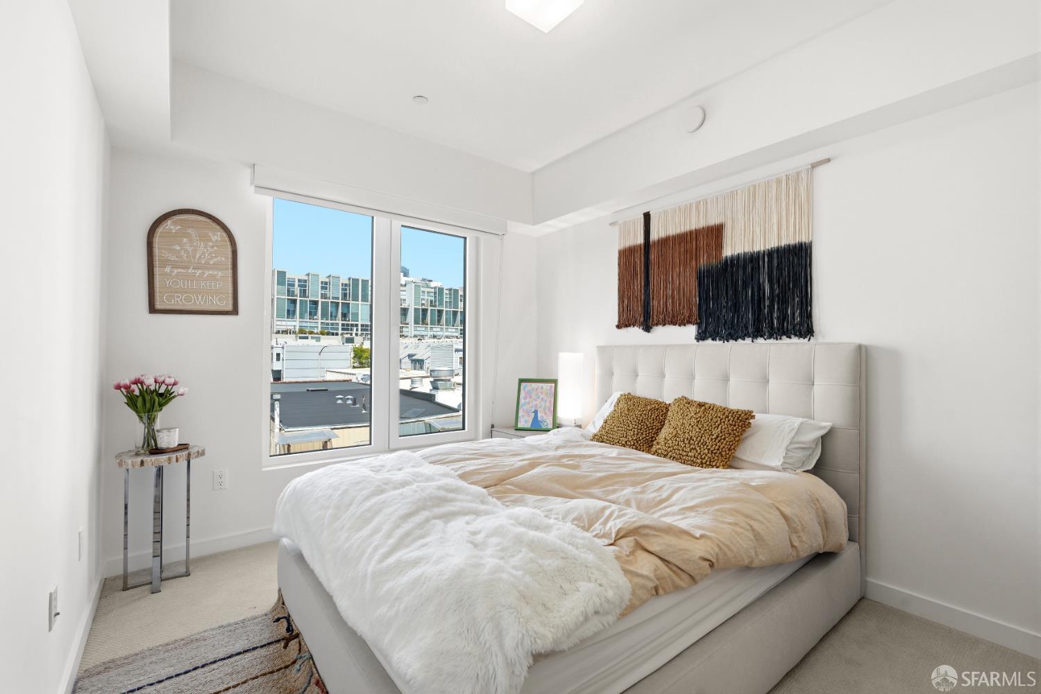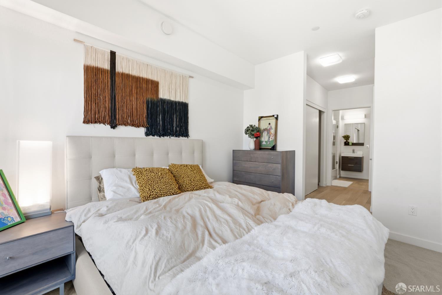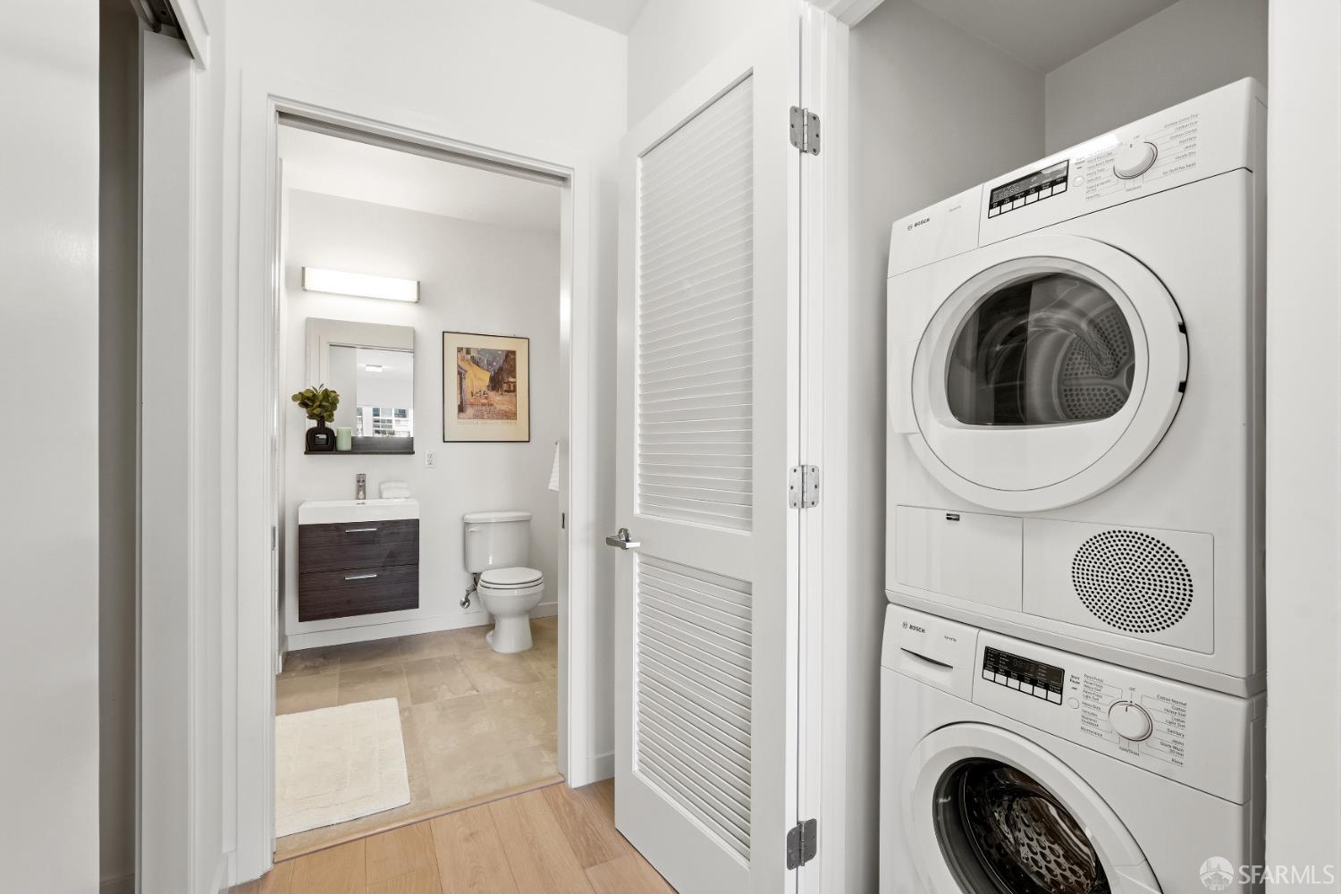 This spotless, move-in ready 1-bedroom, 1-bath condo offers stunning city views and was thoughtfully designed by San Francisco-based JS Sullivan, known for their exceptional quality and mixed-use urban developments. HOA dues include water, garbage, gas, Webpass WiFi internet, exterior insurance, and moremaking city living even more convenient. Featuring an open-concept layout and dramatic floor-to-ceiling bay windows, the home is flooded with natural light, creating a bright and airy atmosphere throughout. Inside, you'll find white oak hardwood flooring, a newly carpeted bedroom with a spacious custom-built closet, an upgraded walk-in shower with sleek glass enclosure, ample pantry storage, radiant floor heating, and elevated finishes including Grohe fixtures, Caesarstone countertops, and a Porcelanosa Krion backsplash. The chef's kitchen is complete with a vented-out gas range, Bertazzoni stove, and Bosch appliances, including a dishwasher, refrigerator, and an in-unit washer and dryer with a safety pan for added peace of mind. Built in 2015, this modern boutique 26-unit luxury building at 870 Harrison is tucked away in a quiet pocket of Yerba Buena/South Beach/SoMa, offering residents a rooftop garden with breathtaking 360-degree city views and convenient bike storage.