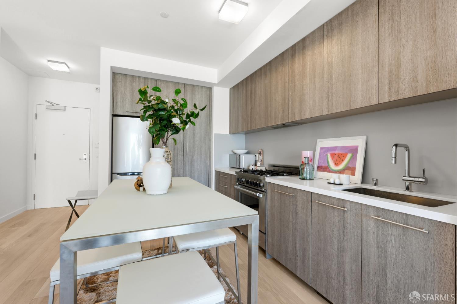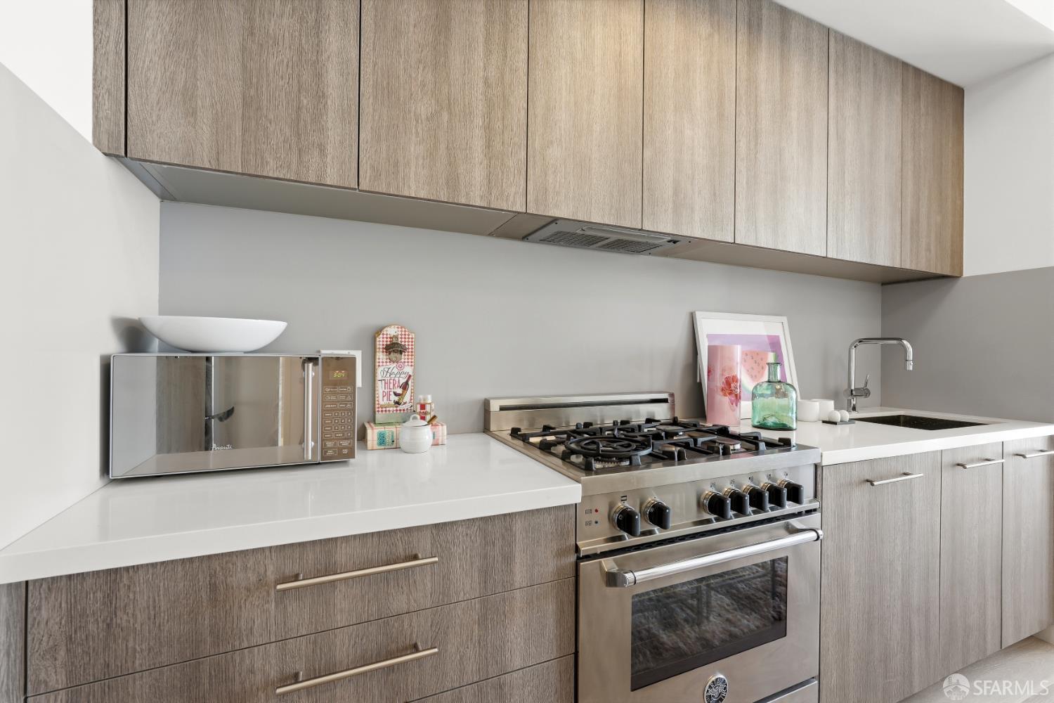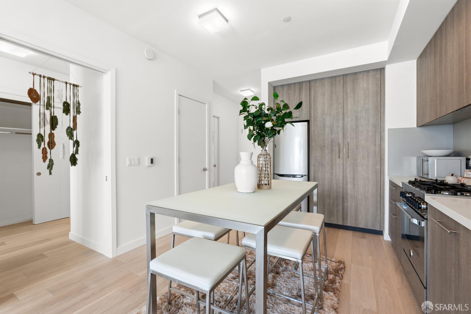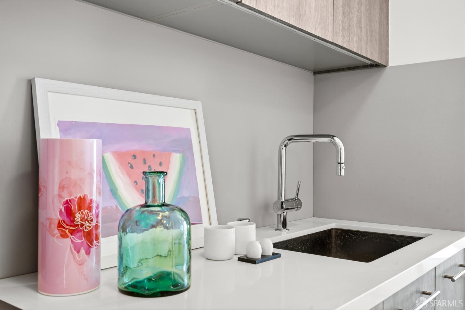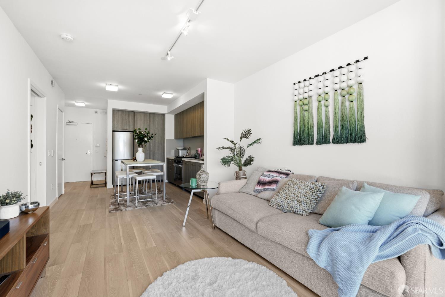 This spotless, move-in ready 1-bedroom, 1-bath condo offers stunning city views and was thoughtfully designed by San Francisco-based JS Sullivan, known for their exceptional quality and mixed-use urban developments. HOA dues include water, garbage, gas, Webpass WiFi internet, exterior insurance, and moremaking city living even more convenient. Featuring an open-concept layout and dramatic floor-to-ceiling bay windows, the home is flooded with natural light, creating a bright and airy atmosphere throughout. Inside, you'll find white oak hardwood flooring, a newly carpeted bedroom with a spacious custom-built closet, an upgraded walk-in shower with sleek glass enclosure, ample pantry storage, radiant floor heating, and elevated finishes including Grohe fixtures, Caesarstone countertops, and a Porcelanosa Krion backsplash. The chef's kitchen is complete with a vented-out gas range, Bertazzoni stove, and Bosch appliances, including a dishwasher, refrigerator, and an in-unit washer and dryer with a safety pan for added peace of mind. Built in 2015, this modern boutique 26-unit luxury building at 870 Harrison is tucked away in a quiet pocket of Yerba Buena/South Beach/SoMa, offering residents a rooftop garden with breathtaking 360-degree city views and convenient bike storage.